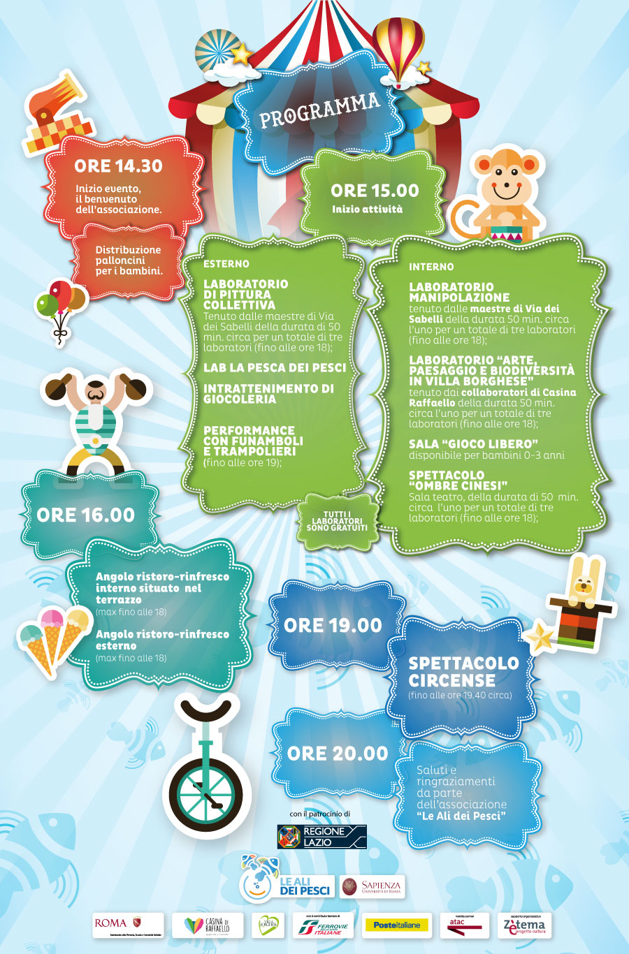 A partire dalle ore 15.00 si terranno laboratori di pittura collettiva e di Manipolazione a cura del Dipartimento di Neuroscienze Umane – Sezione di Neuropsichiatria dell’Infanzia e dell’Adolescenza di Via dei Sabelli dell’Università La Sapienza di Roma e per tutto il pomeriggio ragazzi, bambini e famiglie potranno scegliere tra le numerose attività proposte all’interno e all’esterno della struttura: una speciale pesca dei pesci, performance con funamboli, giocolieri, mangiafuoco, equilibristi e cantastorie, giochi all’aperto e laboratori artistici sulla biodiversità in Villa Borghese fino allo spettacolo “Ombre Cinesi” presso la Sala Teatro di Casina Raffaello.